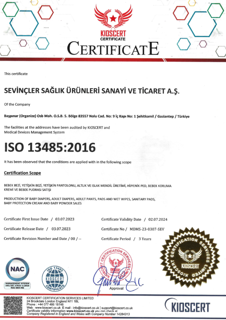 Bünyemizdeki 400’ü aşkın nitelikli çalışanımızla büyük bir aile olarak, her geçen gün sektörümüzde liderliğe doğru emin adımlarla ilerlemekteyiz. Sevinçler Sağlık Ürünleri A.Ş. olarak, kalitemizden ve kurumsal değerlerimizden asla taviz vermeden, modern tesisimizde ürettiğimiz dünya standartlarındaki ürünleri bugün Dünya’nın 80’ten fazla ülkesine ihraç etmekteyiz.